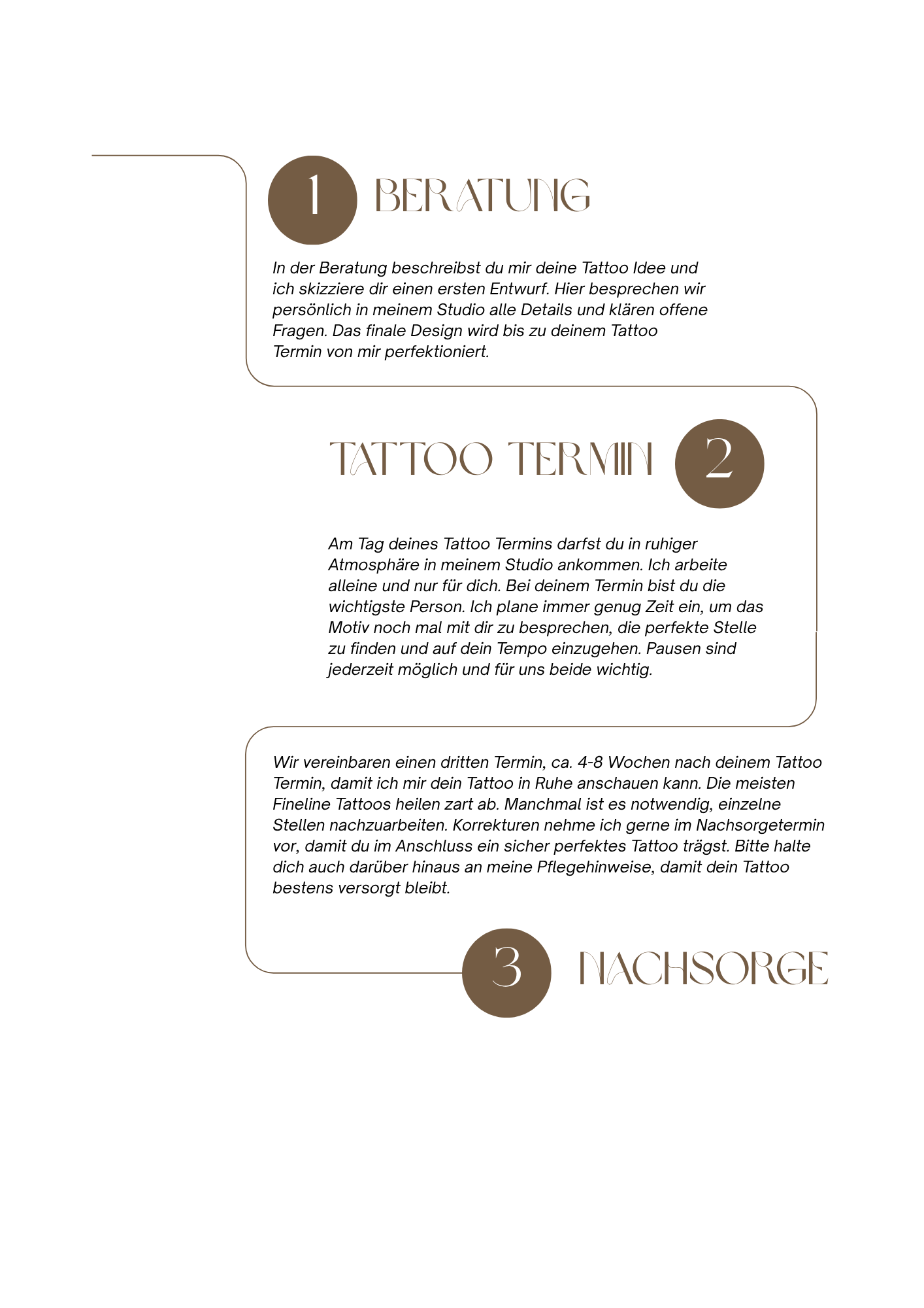 Ich nehme mir ganz bewusst Zeit für deine meditative Auszeit, während deiner Tattoo Zeremonie bist du exklusiv im Studio, es wird nicht parallel gearbeitet, damit du zur Ruhe kommen und den Prozess genießen kannst.